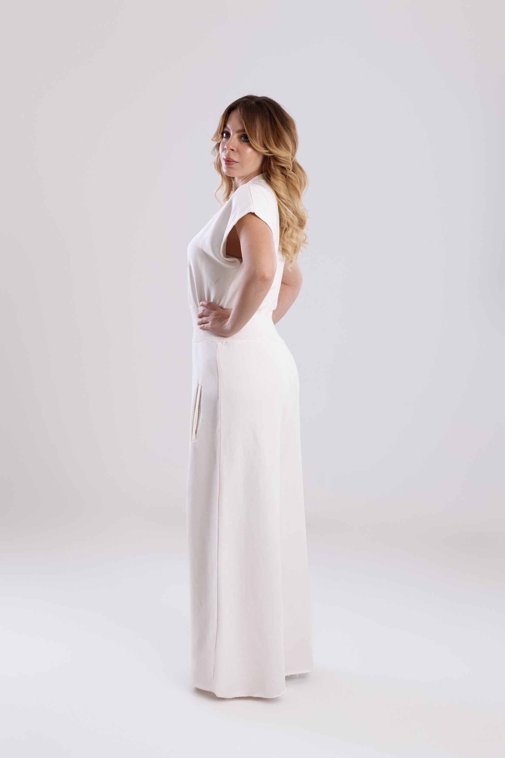The Pants: The lower half flows into dramatic, extra-wide legs, providing an elegant and incredibly comfortable feel. Functional deep side pockets add convenience, making this the perfect piece for all-day wear. Simply step in, and you're ready to go.