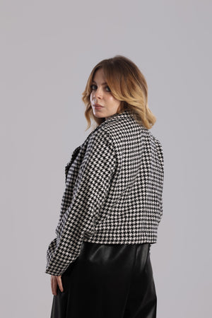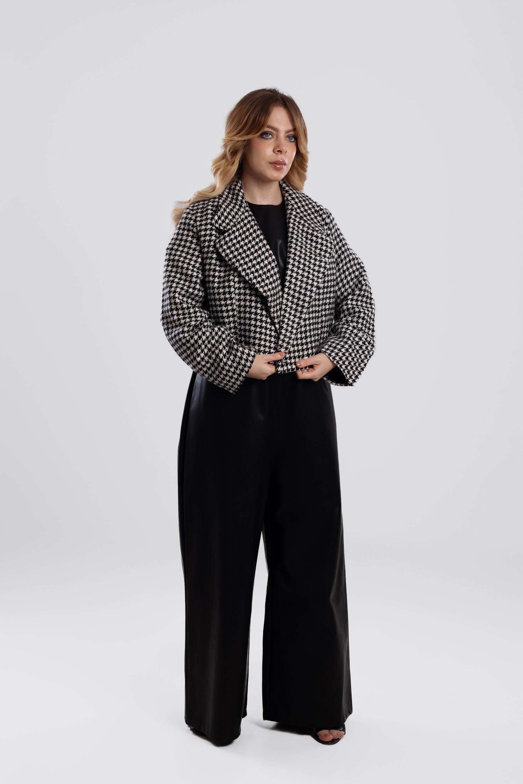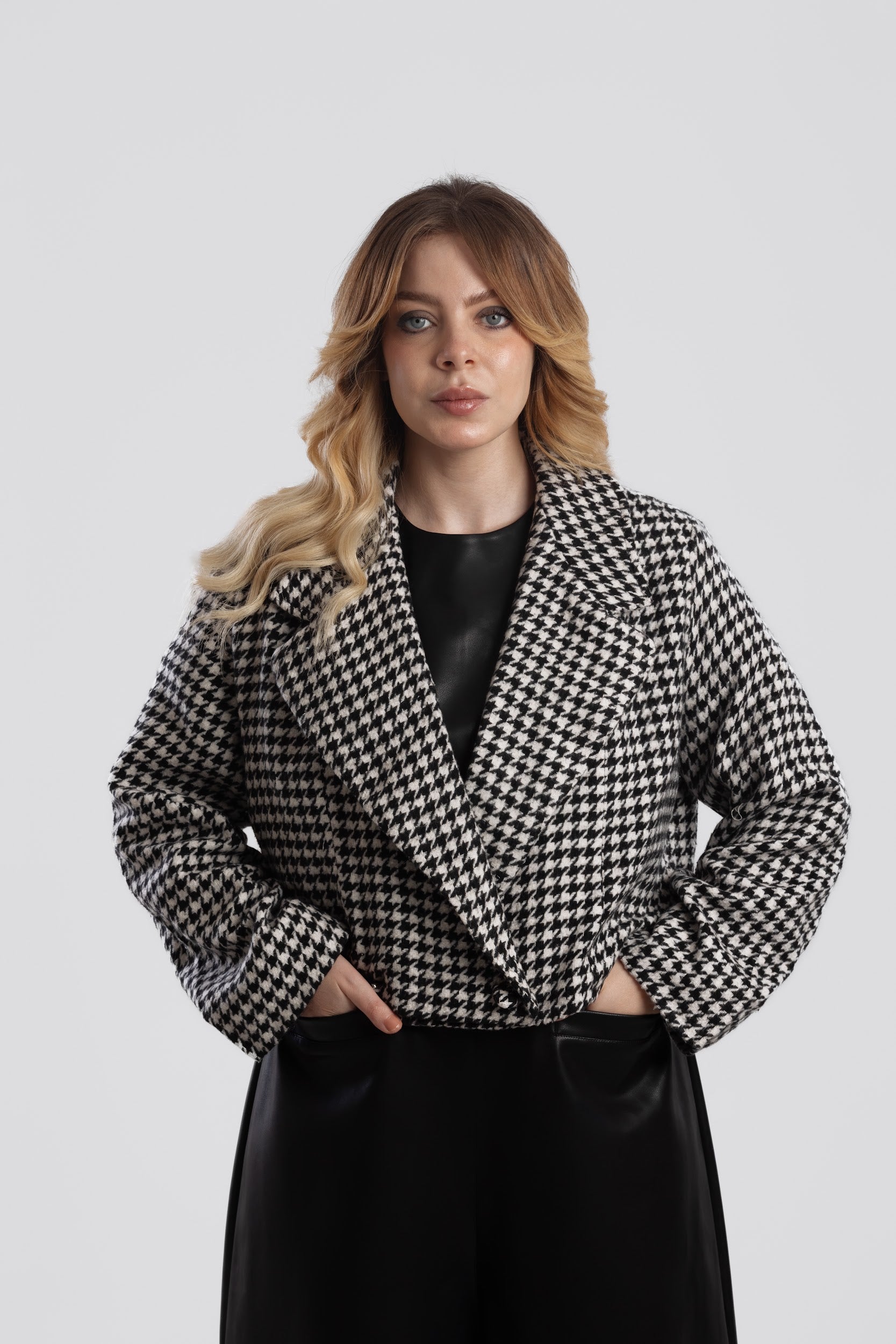 This double-breasted jacket is expertly tailored from a premium wool-blend fabric featuring a timeless black and white micro-houndstooth pattern.